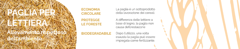 La paglia di cereali è il materiale ideale per la lettiera degli avicoli, grazie alla sua naturalità, alla funzione assorbente e alla biodegradabilità in fase di smaltimento.