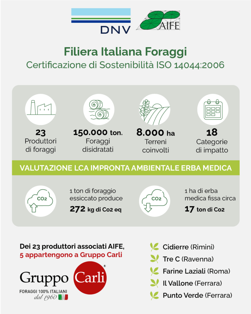 意大利脱水饲料协会(AIFE)已完成对以苜蓿为原料的脱水饲料的环境足迹量化评估,并获得了由全球最具权威性的认证机构之一 —— DNV颁发的 ISO 14044:2006 标准认证。