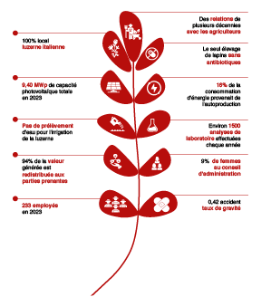 Environ 230 employés travaillent directement dans les entreprises de notre groupe en plus des milliers d’agriculteurs et de travailleurs d’entreprises locales qui font partie de l’induit de l’entreprise. Nos usines, en raison précisément de notre travail, sont éloignées des centres urbains et sont situées dans des zones rurales souvent menacées par la dépopulation et le chômage. Qu’il s’agisse de l’usine de San Leo située dans les collines de l’arrière-pays de la Romagne, ou celle de Ponzano Romano, dans la campagne de la vallée du Tibre, la transformation des terrains, les activités liées à la transformation des fourrages, l’assistance technique, l’approvisionnement des matières premières, les transports, sont effectués par des personnes du territoire, créant ainsi les conditions pour maintenir la base de l’emploi et stopper la dépopulation.