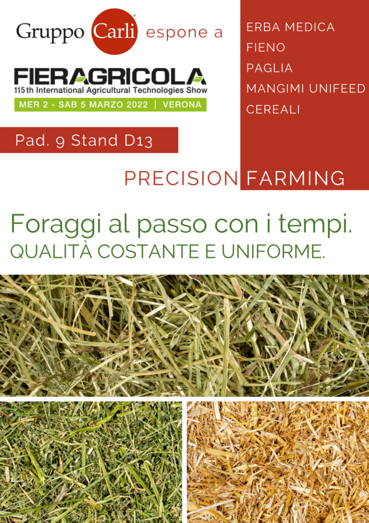 Nello stand D13 nel Padiglione 9 di VeronaFiere, dal 2 al 5 marzo si potranno toccare con mano i foraggi selezionati e le lettiere naturali Gruppo Carli, interamente coltivati e lavorati in Italia, insieme ai mangimi TotalFeed che, grazie alla formulazione personalizzata, alla composizione 100% naturale ed alla semplicità gestionale, possono fare la differenza nell’offerta mangimistica, mettendo a disposizione dell’allevatore un sistema alimentare al passo con i tempi: nutriente, rispettoso del bioritmo degli animali e sostenibile.