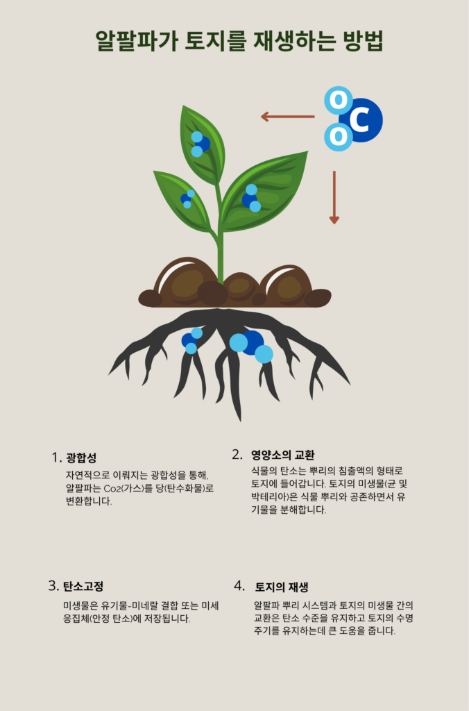 지구와 토지에 바로 환경을 위해 매우 중요한 친환경 생태계가 필요합니다. 토양의 유기물질은 가장 큰 탄소 저장소와 같아서 농업에 중요한 비옥함을 결정하는 아주 근본적인 역할이고 식물의 성장을 지원하고 물과 영양소의 주기 회전을 조절할 수 있습니다. 알팔파의 가장 공통적인 특징은 바로 대기 질소를 흡수한다는 것이며, 뿌리 줄기와 세균이 공생하여 토양의 비옥함을 유지하는 것입니다. 동시에 지하수의 질산염의 오염위험을 줄이고 다량의 이산화탄소를 흡수합니다.