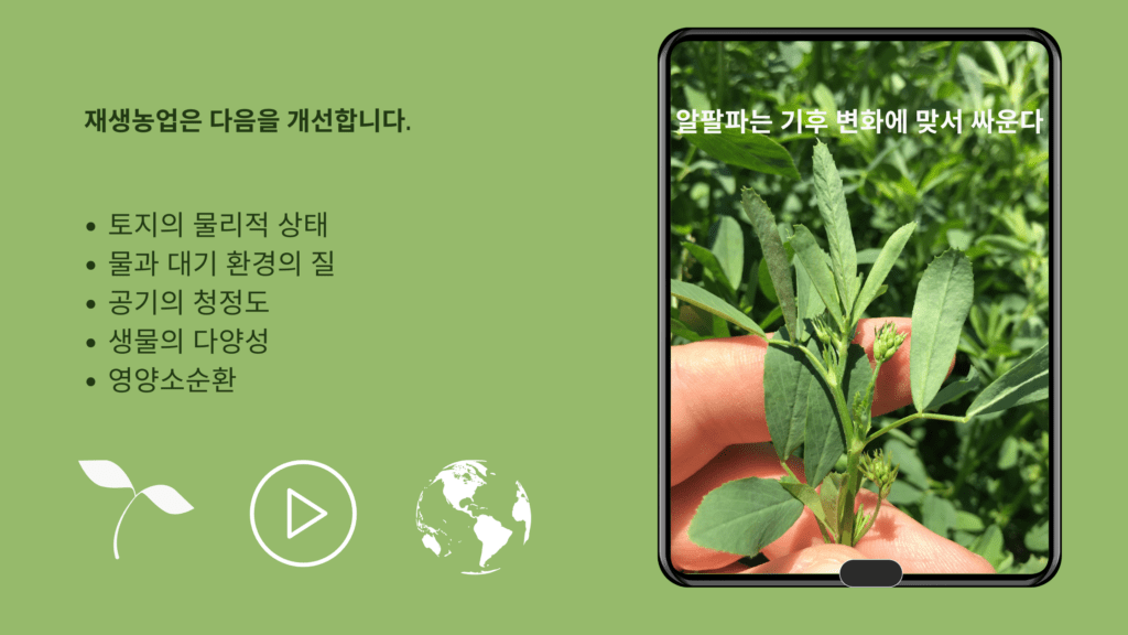 재생농업은 토지의 건강을 회복시키고 물과 탄소의 사이클의 균형을 다시 맞춰서 자연으로 하여금 지구자원을 다시 재생하는 방식으로 농업을 하는 것을 뜻합니다. (Rodale Institute)