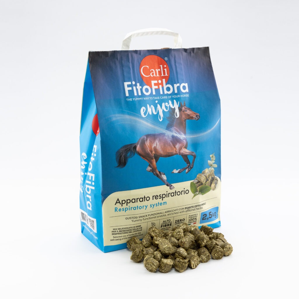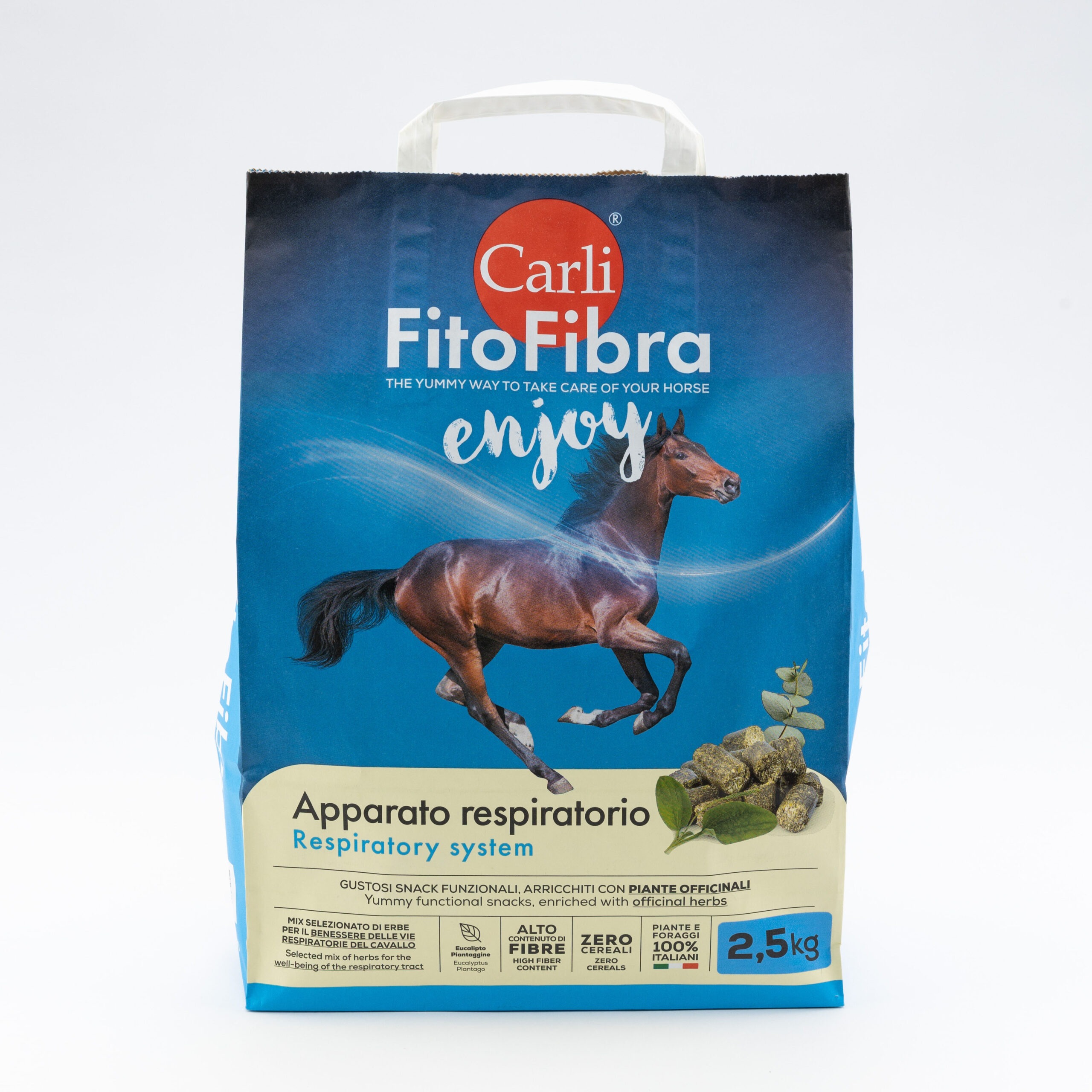 Carli FitoFibra Enjoy Apparato Respiratorio è un mangime complementare sotto forma di pellettone, altamente appetibile, composto da una miscela bilanciata di foraggi di nostra produzione e piante officinali tra cui eucalipto, piantaggine, sambuco.