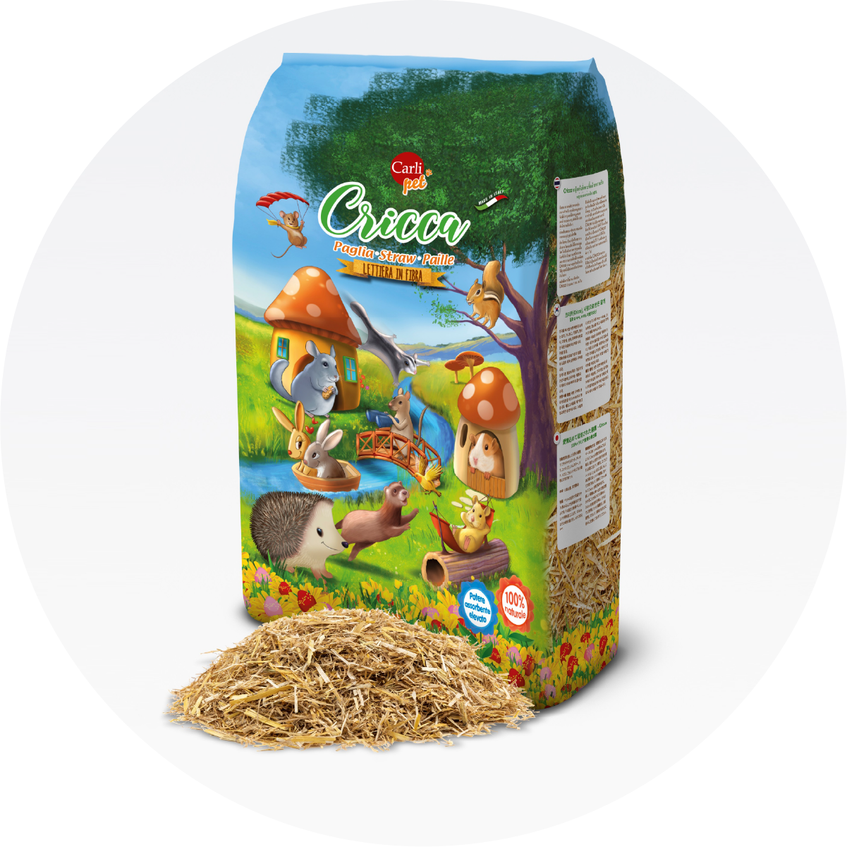 Lettiera naturale composta al 100% da paglia di cereali depolverizzata, ideale per conigli, porcellini d’india, cincillà, gerbilli, criceti, scoiattoli, topi, furetti e altri piccoli animali.